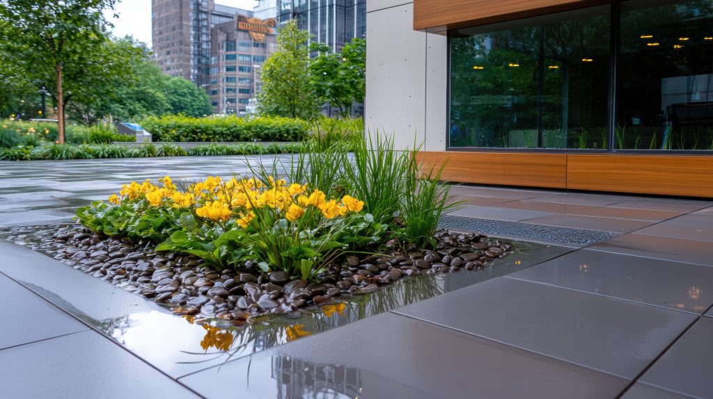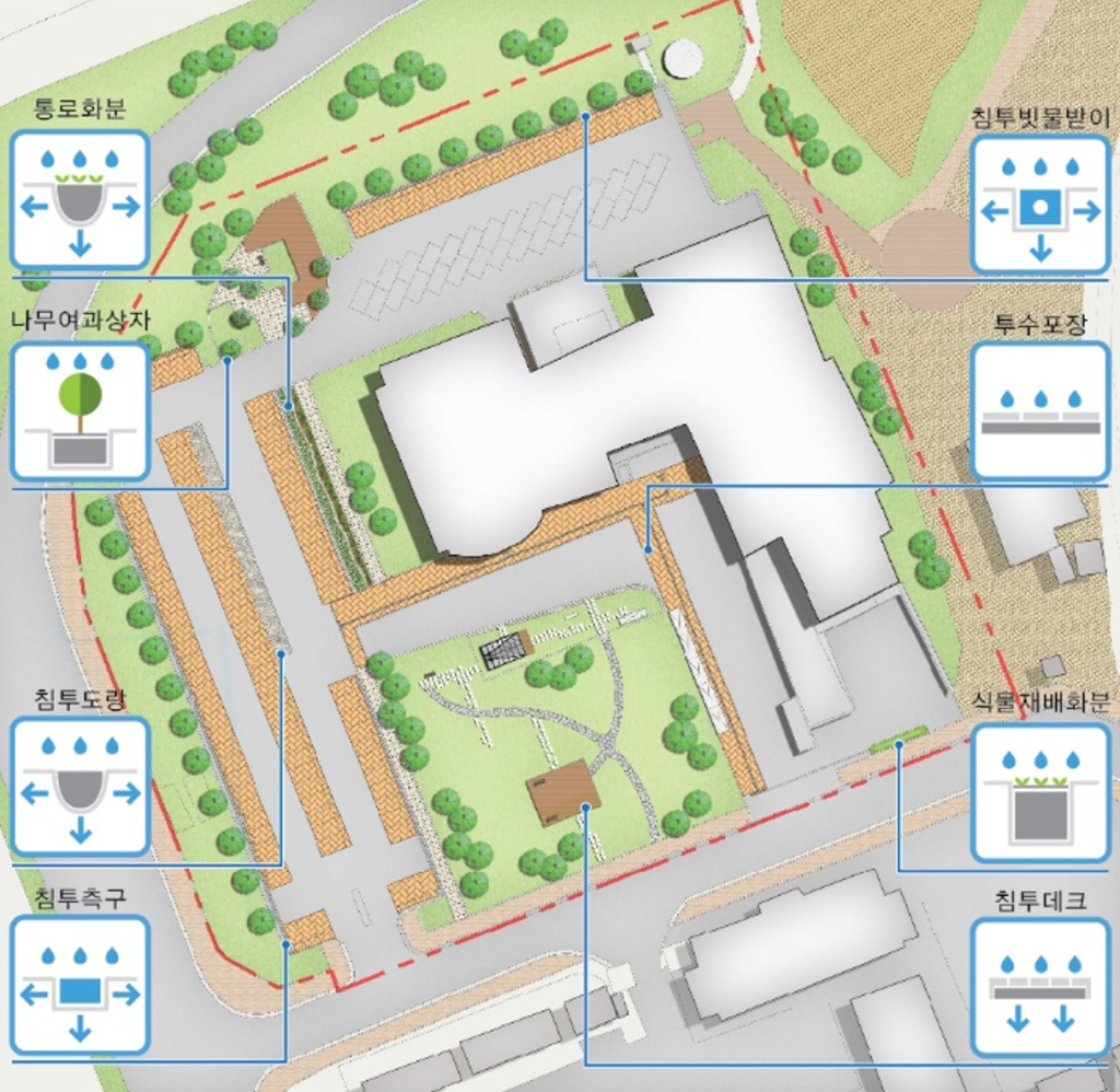 기존의 빗물을 하수관거를 통해 빠르게 배출시키는 중앙집중식 방식에서 벗어나, 빗물이 발생한 현장에서 저류, 침투, 여과, 증발산 등의 자연적인 과정을 통해 강우유출량을 직접 관리하는 분산식 시스템을 의미합니다.