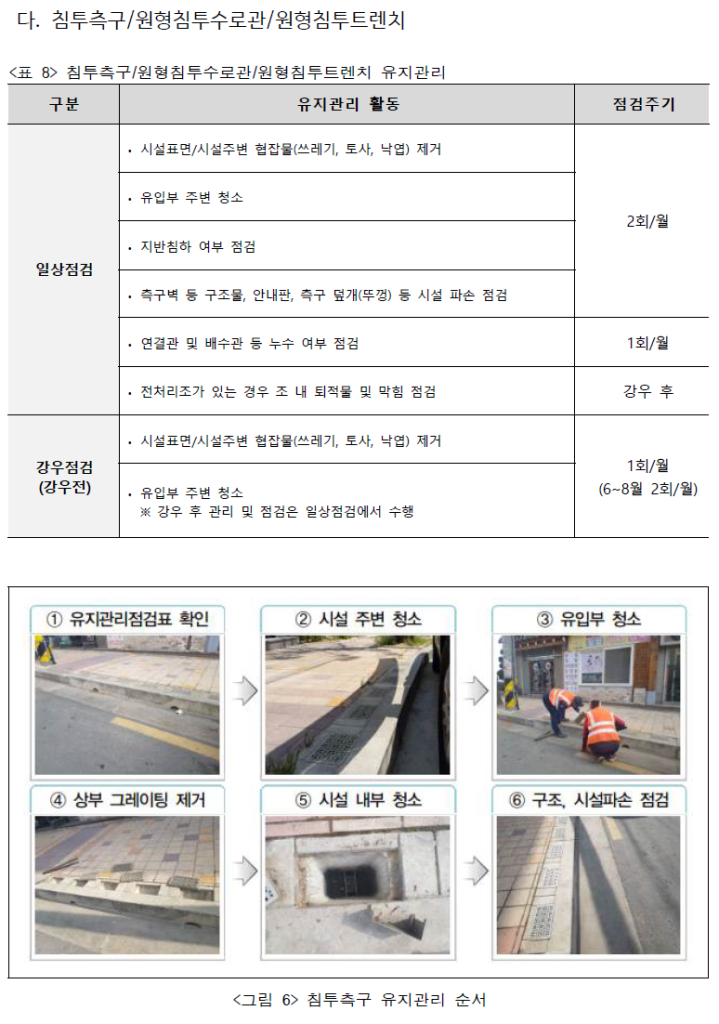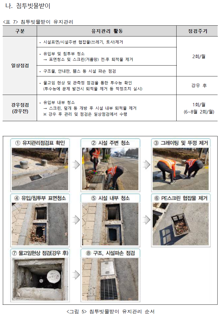 제1장 총칙 제2조(도시·군계획시설결정의 범위) ③ 주차장, 공원, 녹지, 유원지, 광장, 학교, 운동장, 공공청사, 문화시설, 도서관, 청소년수련시설 및 종합의료시설을… 저류시설 및 주민대피시설 등을 포함하여 도시·군계획시설결정을 할 수 있다. <신설 2012.10.31> 제2장 교통시설 제5절 주차장, 제30조(주차장의 결정기준 및 구조·설치기준) 5. 건축물이 아닌 주차장에서 유출되는 빗물을 최소화하도록 빗물이 땅에 잘 스며들 수 있는 구조로 하거나 식생도랑, 저류·침투조 등의 빗물관리시설을 설치하고, 나무나 화초를 심는 경우에는 그 식재면의 높이를 건축물이 아닌 주차장의 바닥 높이보다 낮게 할 것 제3장 공간시설 제1절 광장~제6절 종합의료시설 7. 빗물이용을 위한 시설의 설치를 고려하고, 불투수면에서 유출되는 빗물을 최소화하도록 빗물이 땅에 잘 스며 들 수 있는 구조로 하거나 식생도랑, 저류·침투조, 빗물정원 등의 빗물관리시설 설치를 … 521_e29922-a6> |